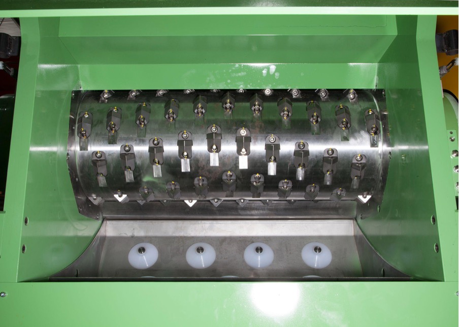 (Internal view of the single shaft rotor chamber. The arrangement of cutting blades against fixed counter-knives delivers controlled shear force across the full rotor width.)